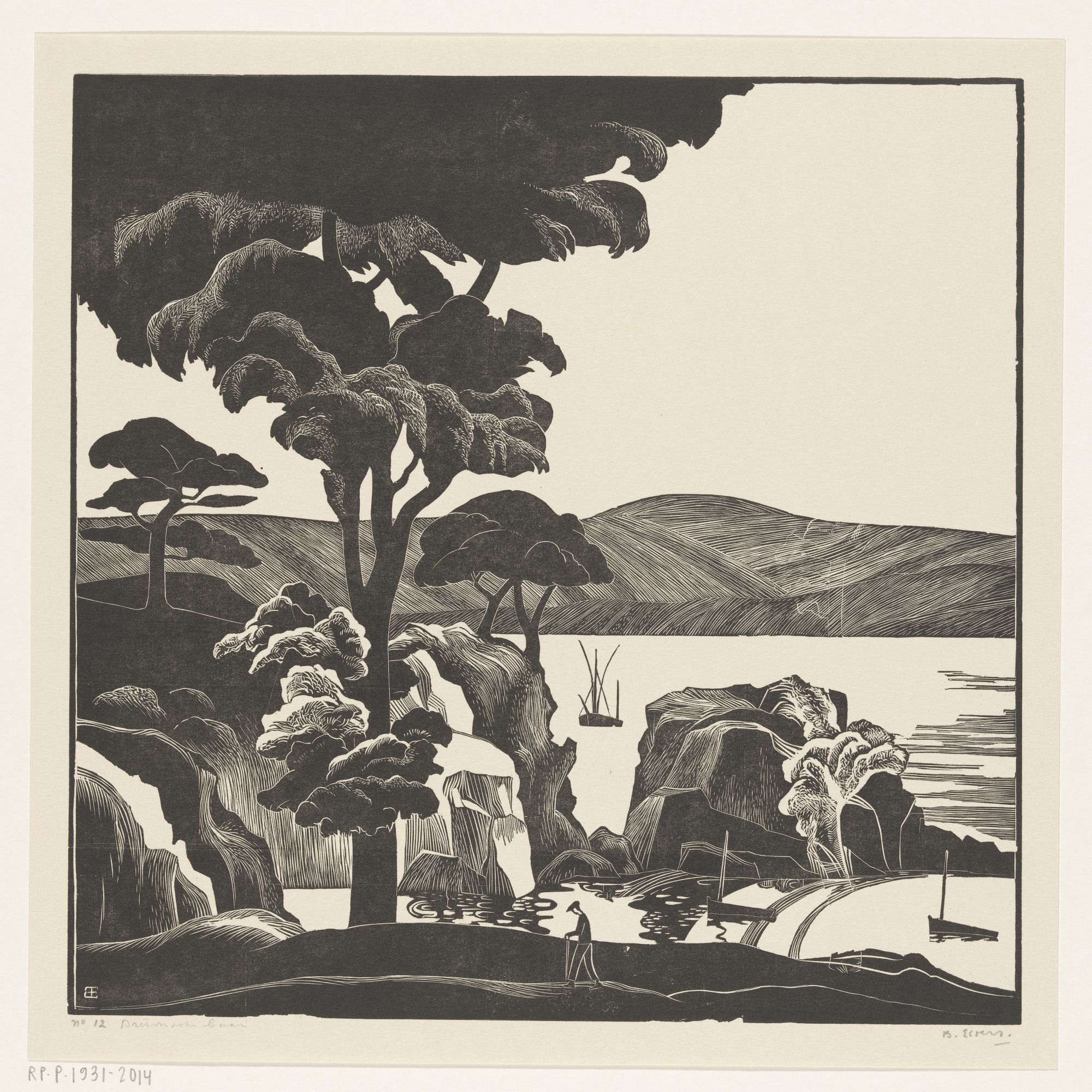 Bernard Essers, Bretonse baai, Douarnenez, 1927, houtgravure. Foto via Rijksmuseum, Amsterdam.