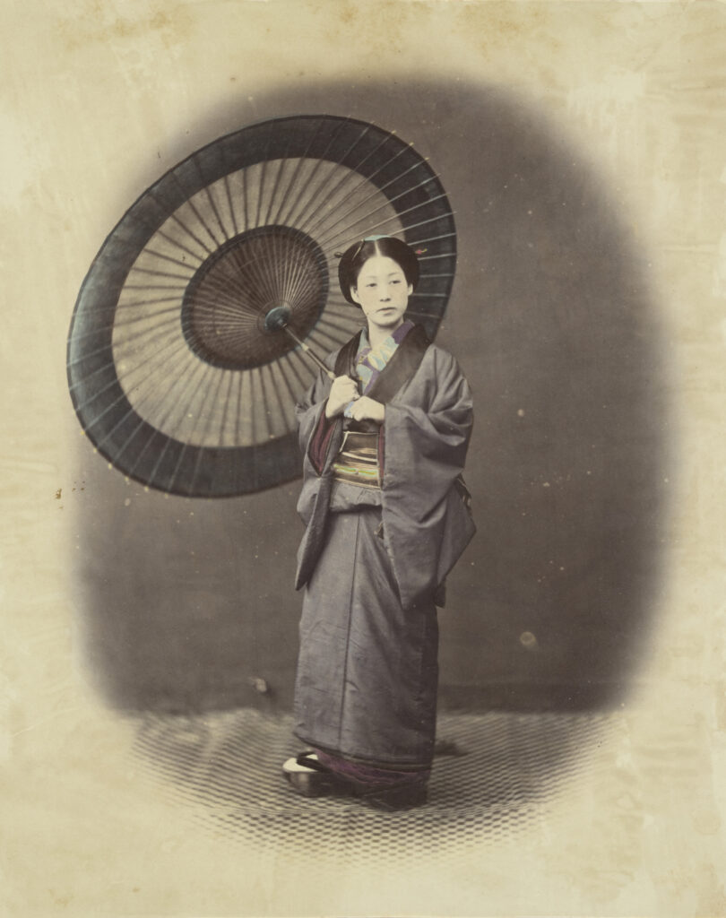 Ingekleurde foto van een Japanse vrouw met een parasol 1867 Felice Beato. Collectie Het Scheepvaartmuseum Amsterdam.
