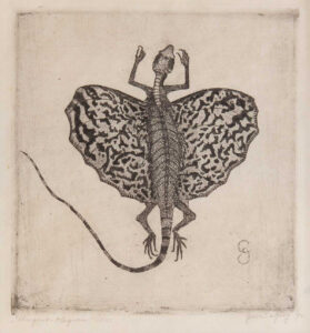 Gerrit de Jong, Vliegende hagedis, ets, eigen druk, 15 x 14 cm.