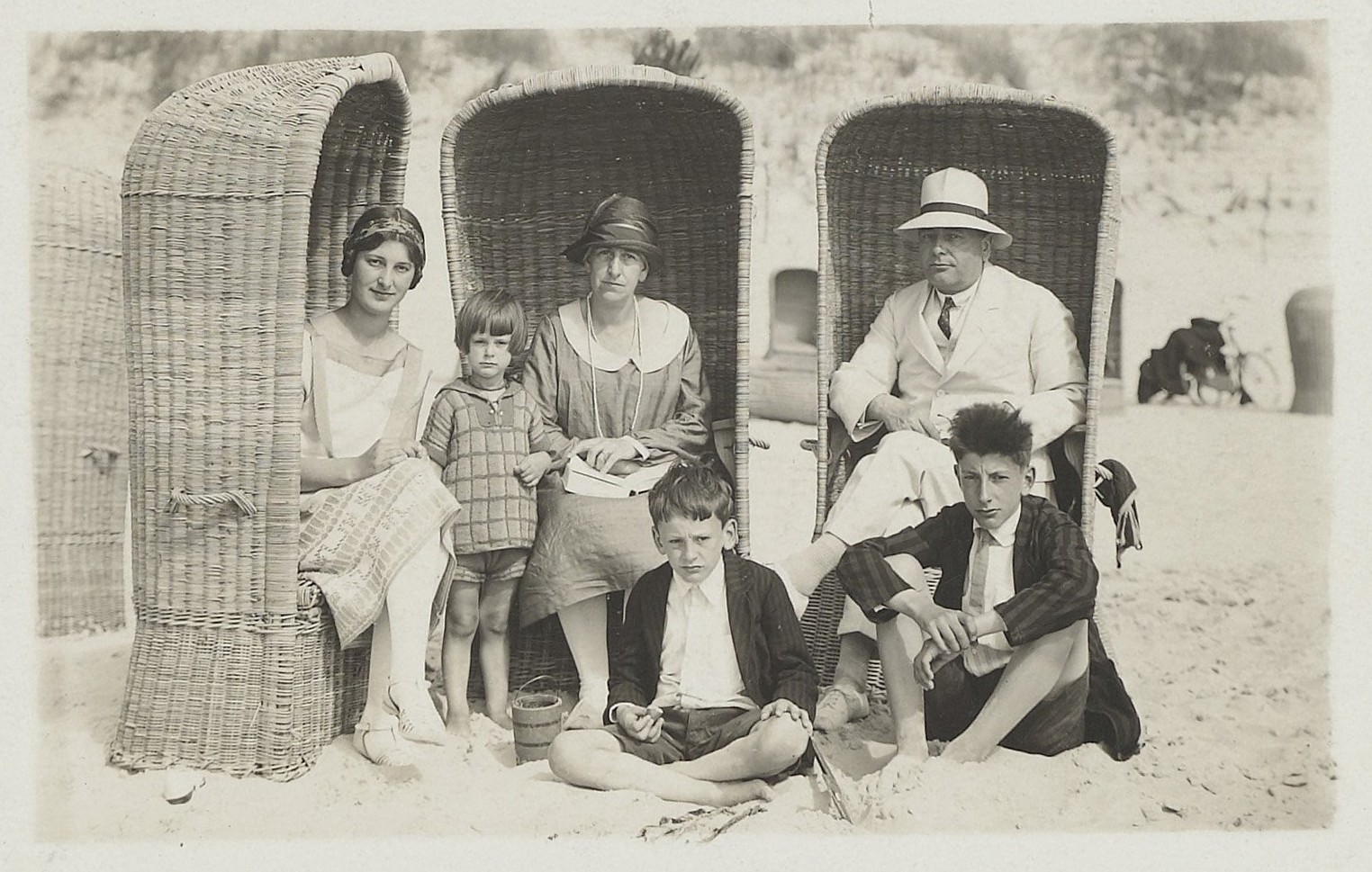 Een familie poseert rond 1925 op het strand van Bergen aan Zee. Beeld via Regionaal Archief Alkmaar.
