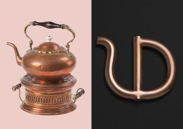 Links: Waterketel met komfoor, collectie Zuiderzeemuseum, 1870-1880 | Rechts: Aldo Bakker, Watering can, 2016.