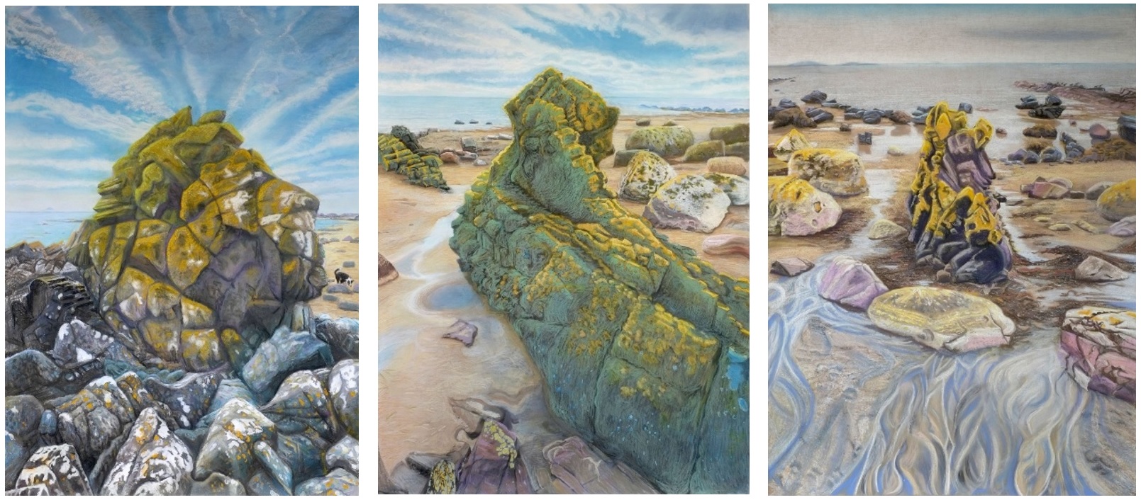 V.l.n.r.: Jacobien de Rooij, Separation of a Continent 3, 2 en 1, 2024, 200 x 150 cm, pastel op papier.