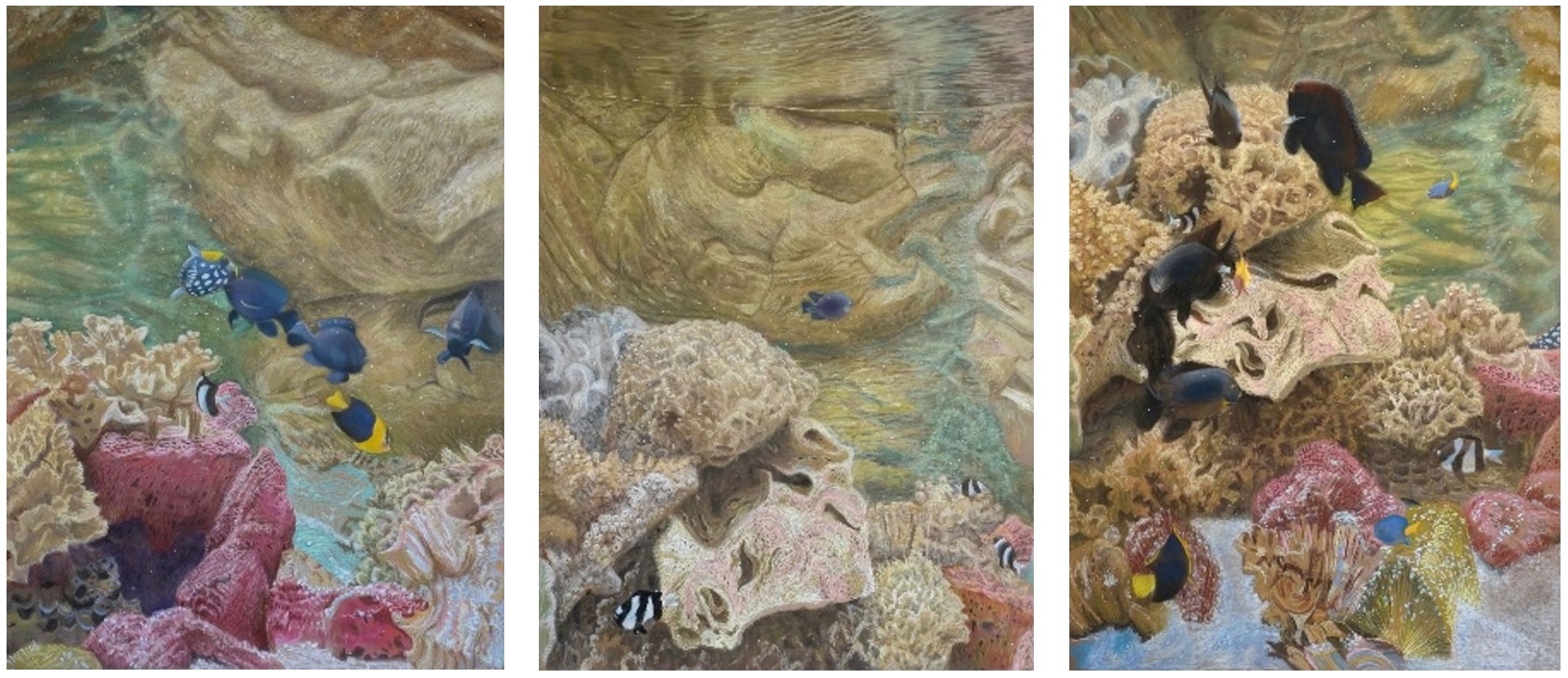 V.l.n.r.: Jacobien de Rooij, Waterverversingen 1, 2 en 3 , 2024, 200 x 150 cm, pastel op papier.
