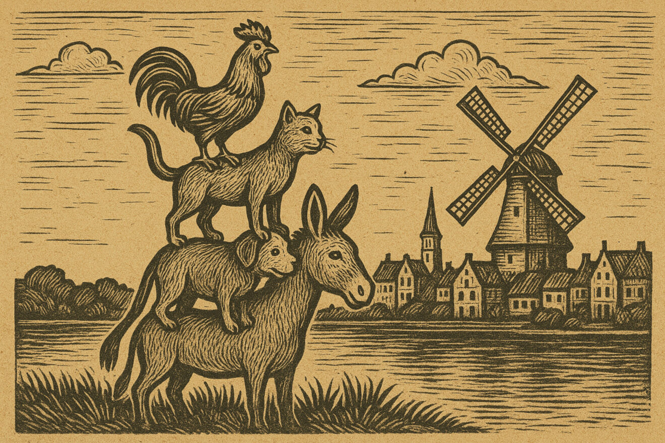 Straattheater Op de Dijck (met Duifje Weeland, Fiona McKenzie, Margot van Dijk en Joke Fieseler) brengt een bijzondere Zaanse versie van het beroemde sprookje De Bremer Stadsmuzikanten van de Gebroeders Grimm. Een oude ezel wordt door zijn baas – de molenaar van De Bleeke Dood – afgedankt. Maar in plaats van bij de pakken neer te zitten, besluit hij zijn geluk elders te zoeken. Onderweg ontmoet hij een hond, een kat en een haan, allemaal met hetzelfde lot. Samen trekken ze richting Zaandam om een nieuw bestaan op te bouwen als stadsmuzikanten. Hun reis leidt tot een avontuur dat alles verandert – en leert dat samenwerking loont.
