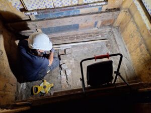 Binnen een bedstede in de stolpboerderij wordt een fundering gedocumenteerd. Foto: Archeologie West-Friesland.