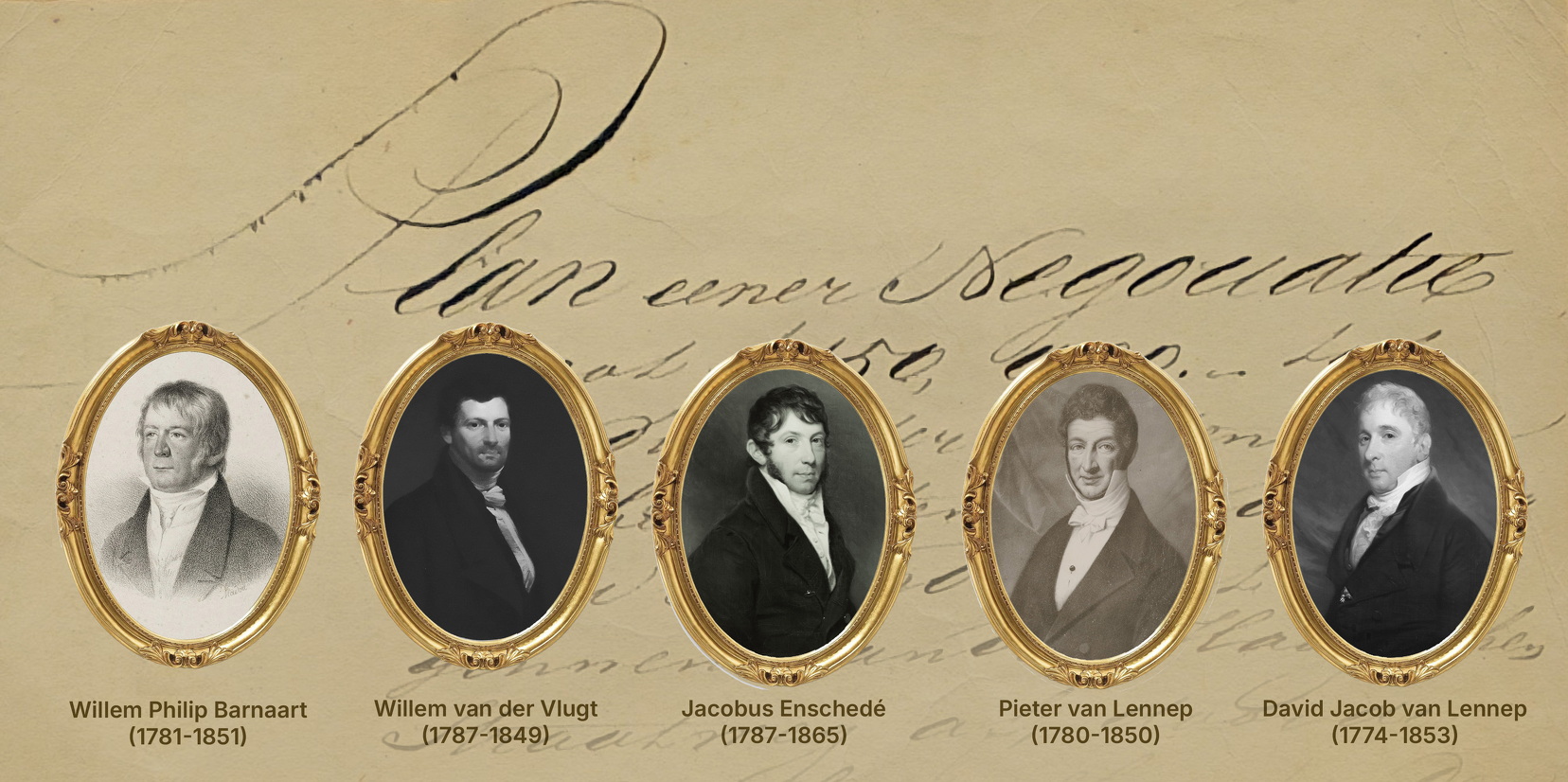 De Heeren Commissarissen die het Plan Eener Negotiatie opstelden. Willem Philip Barnaart, Willem van der Vlugt, Jacobus Enschedé, Pieter van Lennep en David Jacob van Lennep. Beeld: Zandvoorts Museum.