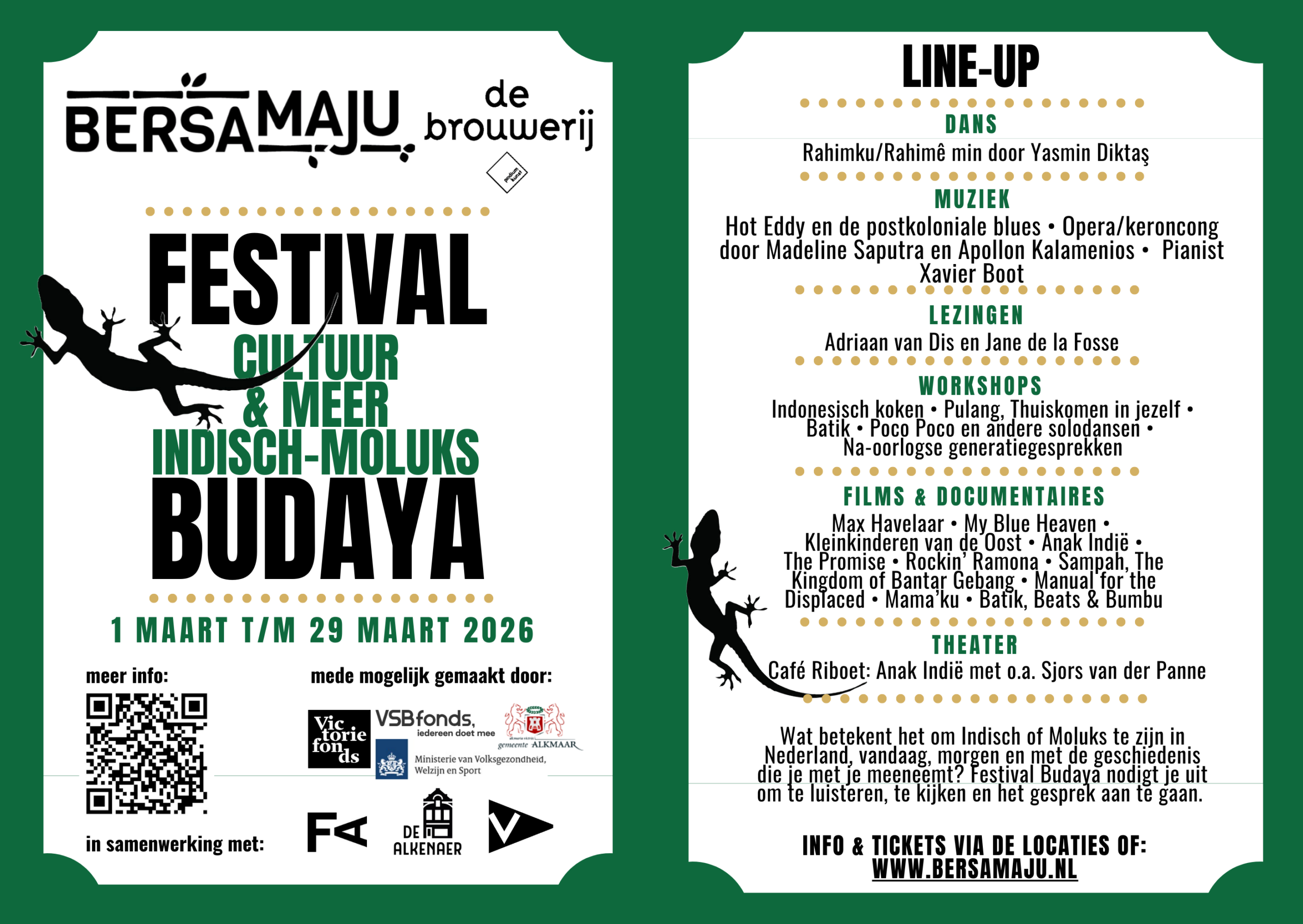 Tickets zijn verkrijgbaar via de deelnemende locaties. Voor het volledige programma en achtergrondinformatie bezoek je de website van BersaMaju: www.bersamaju.nl