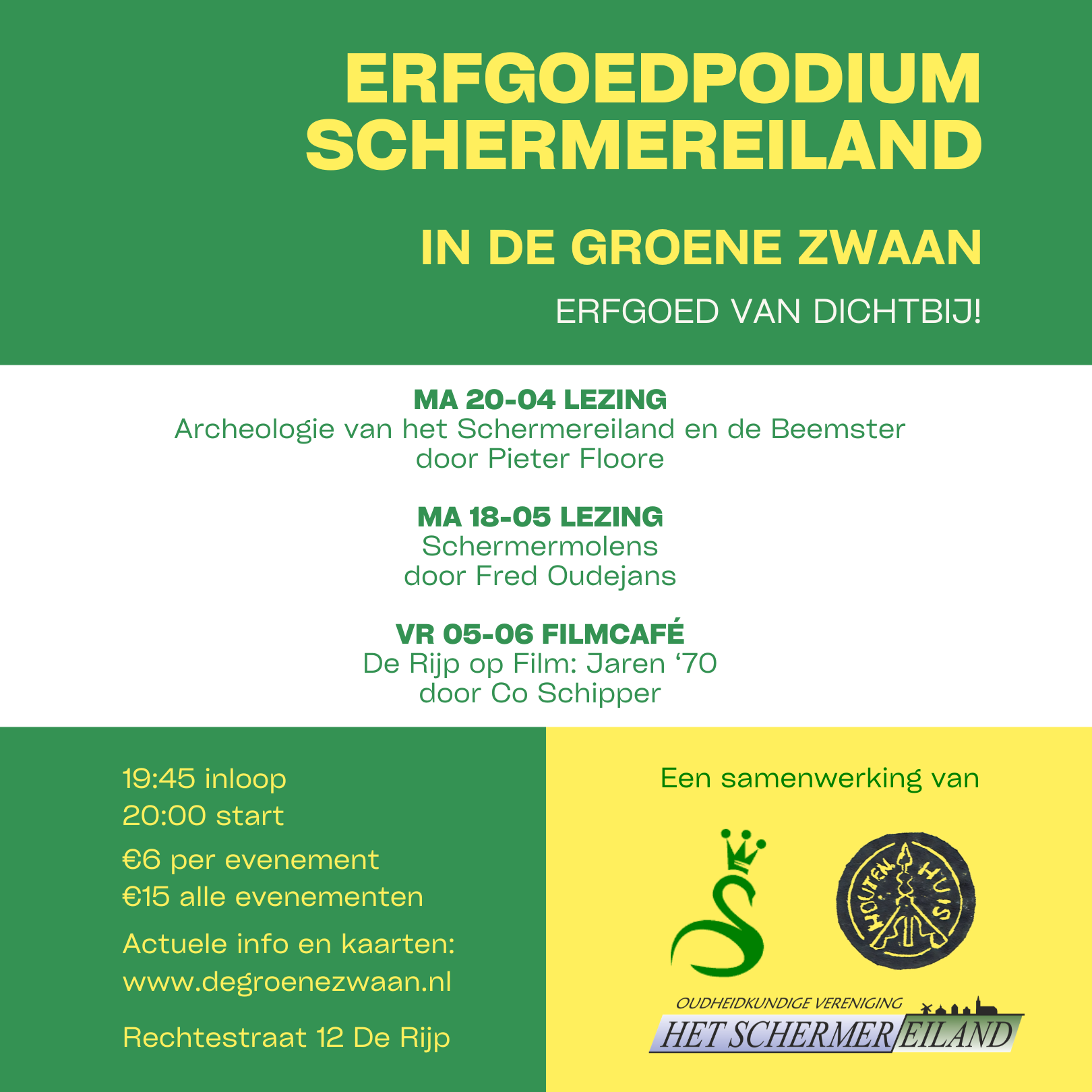Ticketpagina: https://degroenezwaan.nl/product/erfgoedplatform-schermereiland-pieter-floore/ (koop hier ook je passe-partout!)