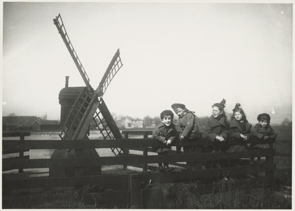 De vijf kinderen Bakker bij een weidemolen in 1924.