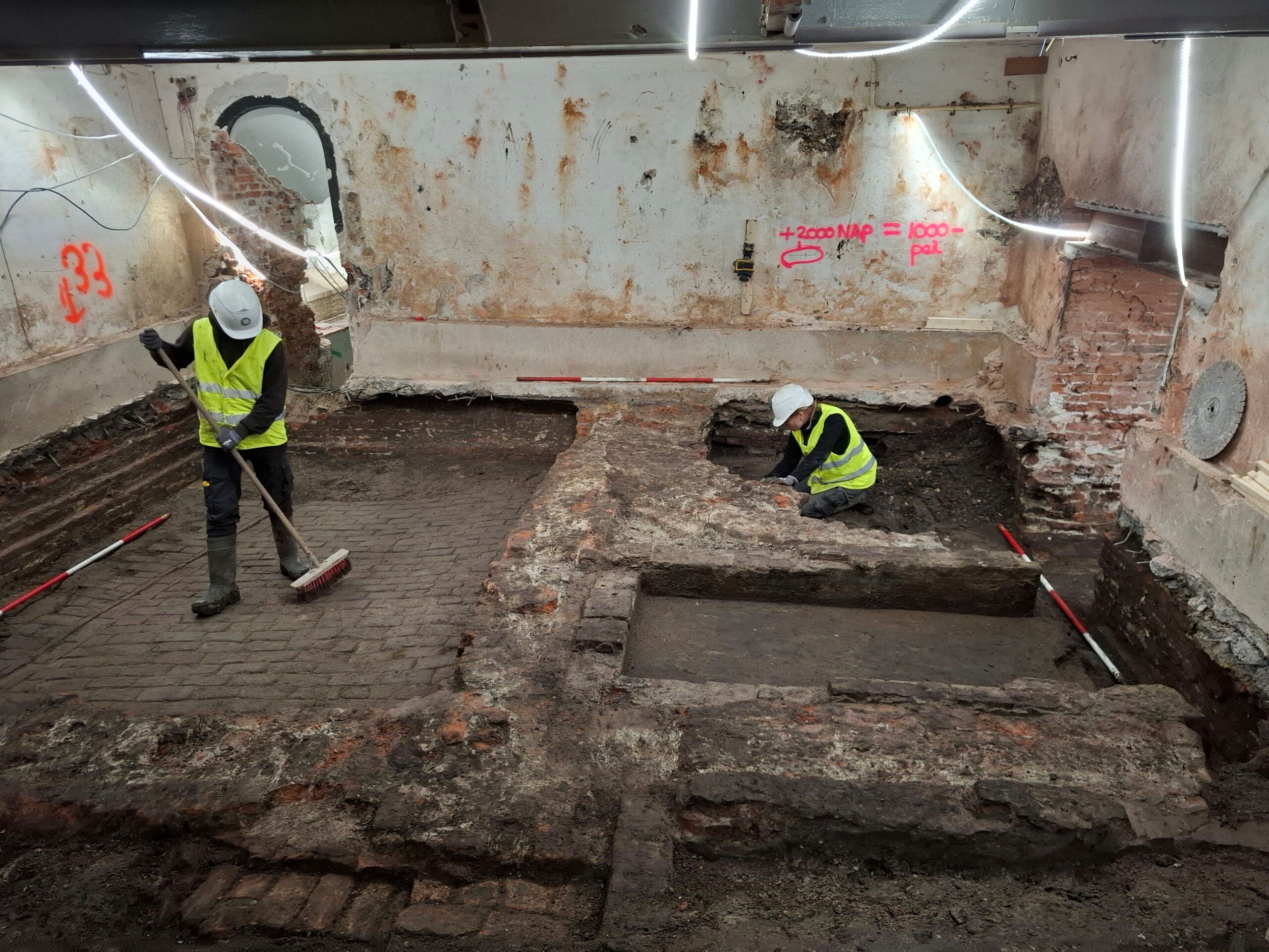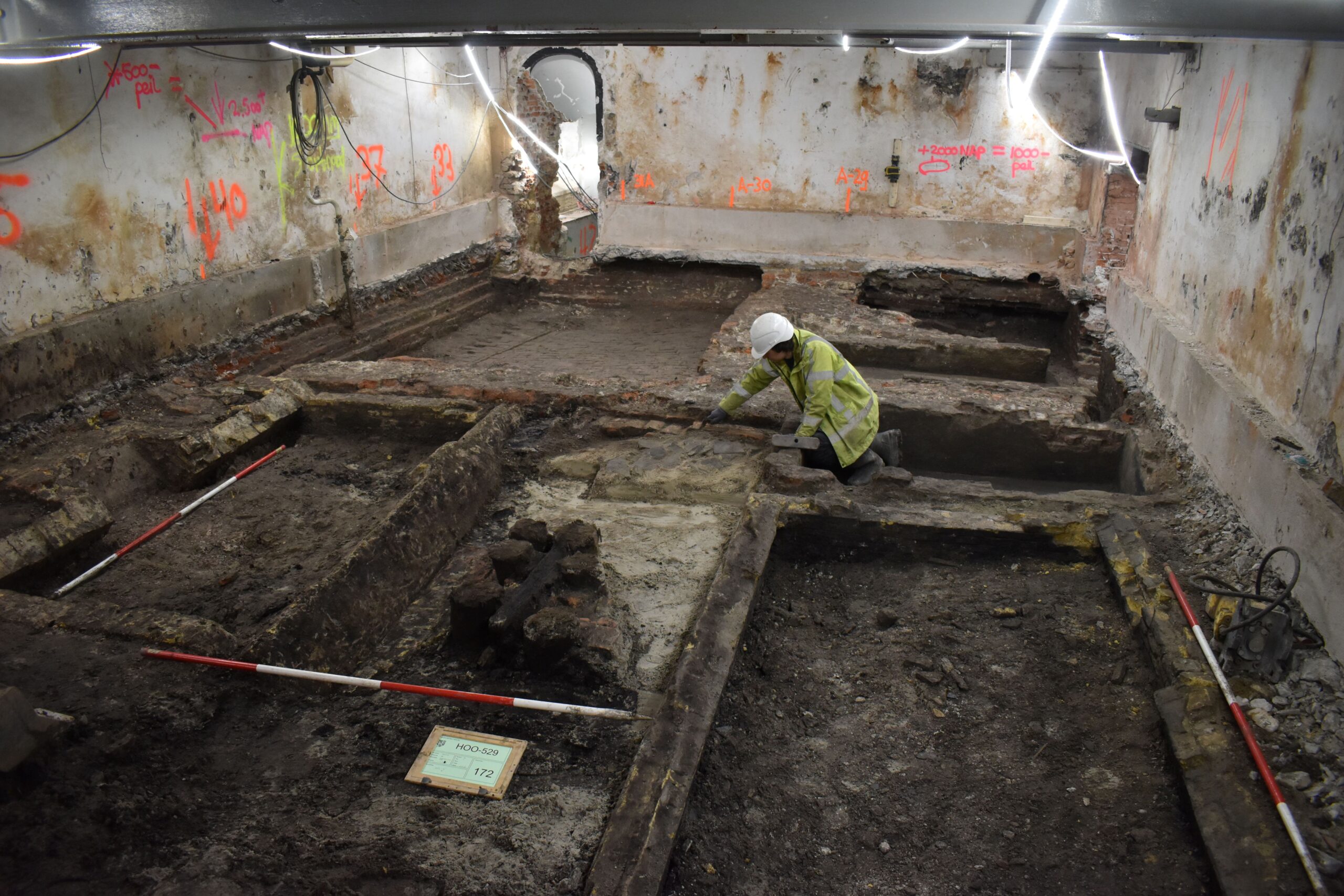 De verbouwing van het Westfries Museum is momenteel in volle gang. Een belangrijk onderdeel hiervan is funderingsherstel van de diverse panden aan de Roode Steen. Vanwege het aanbrengen van heipalen, stalen balken en betonnen vloeren wordt grond uitgegraven en daarbij komen veel muren, kelders en andere sporen uit het verleden tevoorschijn. Archeologen van de gemeente Hoorn werken intensief samen met aannemer Koninklijke Woudenberg en heibedrijf SPS Heicombinatie om dit belangrijke erfgoed zo zorgvuldig en effectief mogelijk vast te leggen. De verbouwing moet immers ook gewoon doorgaan. Christiaan Schrickx: “De afgelopen weken hebben we met man en macht gewerkt in de kelders onder Roode Steen 1 waarbij we naast de resten van het oudste stenen huis ook een beerput aantroffen.”