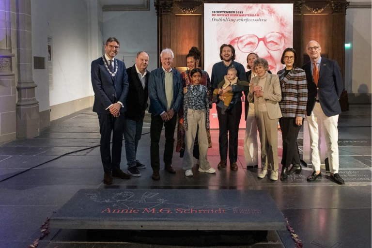 Van links naar rechts Steven van Weyenberg (locoburgemeester), Berry Slok (ontwerper schrijverssteen), Flip van Duijn (zoon van Annie M.G. Schmidt), Babs Gons (schrijver, columnist en dichter), Advika (kinderlocoburgemeester), Jonathan van Duijn met kind (kleinzoon van Annie M.G. Schmidt), Wende Wilbers (uitgever Querido), Hedy d’Ancona (feminist en voormalig minister), Annabelle Birnie en Paul Mosterd (directeur en adjunct-directeur De Nieuwe Kerk). Via Monumentaal.