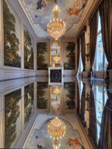 De vloer van de ‘Andriessenkamer’ op de bel-etage van ons 17de-eeuwse grachtenpand, is tijdelijk volledig bedekt met spiegels. In combinatie met de rijke wand- en plafondschilderingen is het net alsof je midden in een visuele illusie staat. De 18de-eeuwse wandschilderingen van Jurriaan Andriessen – een idyllisch landschap vol romantische details – ontmoeten de moderne plafondschildering Droom van verbondenheid (2022) van de Franse kunstenaar Pascal Amblard.