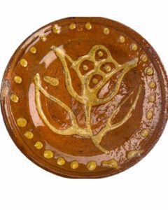Op het bordje is in witte kleipap (dat noemen we ook wel ‘slib’ of ‘engobe’) een tulpversiering aangebracht, naast een randversiering van kleine stipjes in dezelfde witte engobe. Het geheel werd na het aanbrengen van deze tekening gedompeld in een loodhoudend glazuur, waardoor de tekening geel werd op een roodbruine ondergrond. De tekening verwijst vermoedelijk naar de tulpenmanie in de eerste helft van de 17e eeuw. Mensen met geld en invloed leken in die tijd wel behekst door een zucht naar de mooiste en meest exclusieve tulp. Onder andere rond Haarlem en Alkmaar kwamen de eerste in tulpen gespecialiseerde telers op. Men speculeerde op de opbrengst van tulpen nog voor ze uit de grond kwamen. Uiteindelijk leidde de rage in de loop van het jaar 1637 tot wat wel de eerste economische bubbel in onze geschiedenis kan worden genoemd.