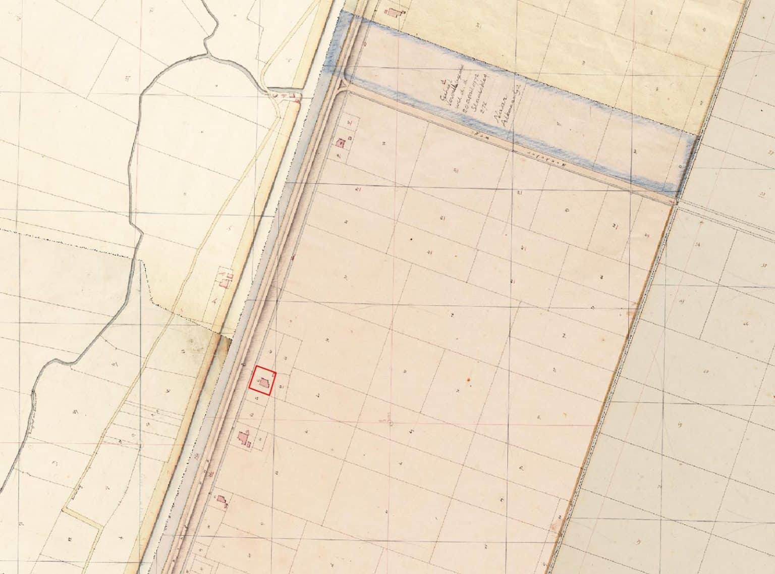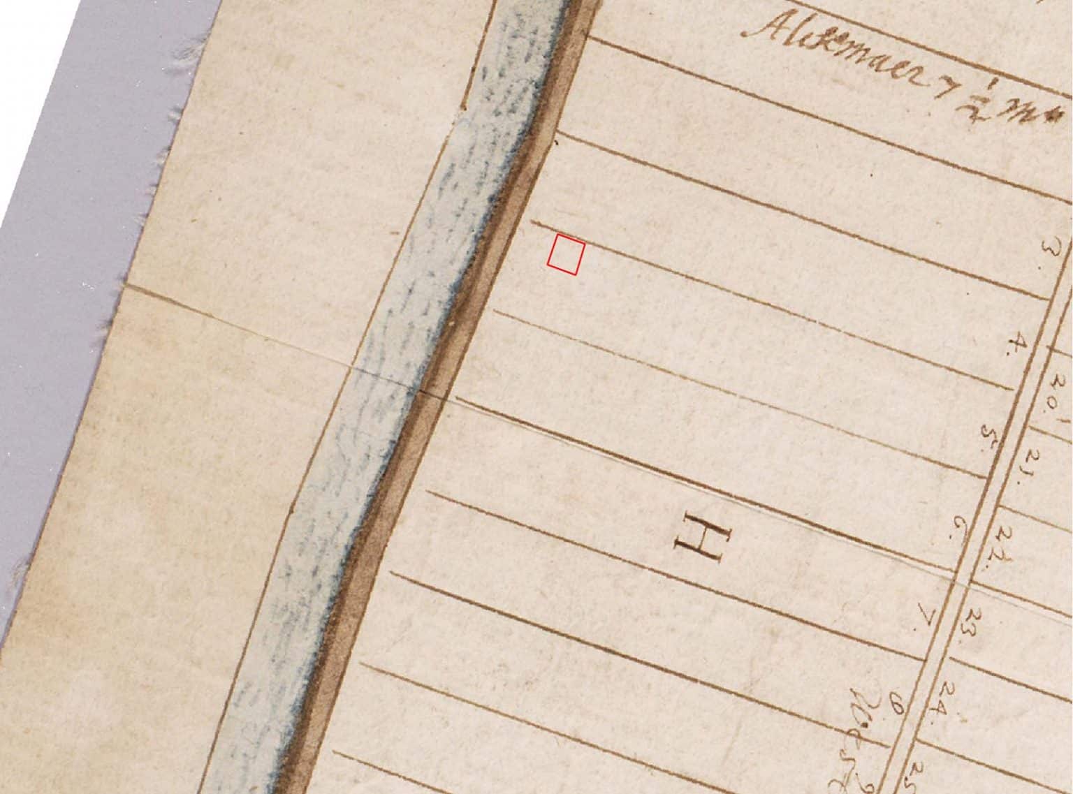 Uitsnede uit het minuutplan, de oudste kadastrale opmeting van het plangebied (1821). Het plangebied is aangegeven door middel van een rode omlijning. Het noorden is boven. Beeld: Erfgoed Alkmaar.