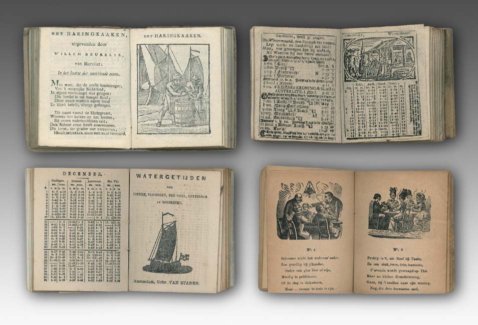 Enkele voorbeelden van de Enkhuizer Almanak verschenen in de 19e eeuw, 1803-1884. Collectie Koninklijke Bibliotheek (KB), beeld via Wikimedia Commons, publiek domein.
