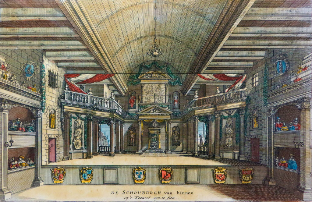 Salomon de Savery beeldde in 1658 het podium in Van Campens schouwburg aan de Keizersgracht af. Helaas werd de schouwburg in 1772 door een brand verwoest Afbeelding uit het besproken boek.