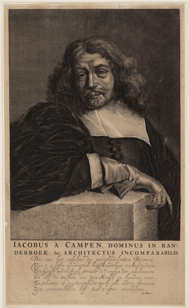 Jacob van Campen (1595-1657) werd in 1596 in Haarlem geboren, maar ging uiteindelijk op het landgoed van zijn familie in Amersfoort wonen. Prent door