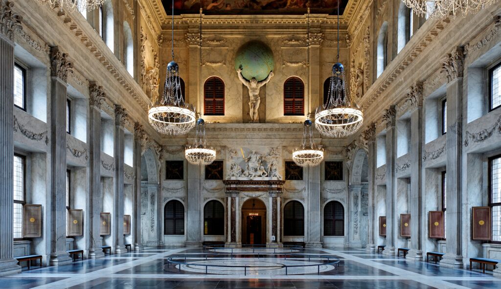 De Burgerzaal van het Paleis op de Dam is 34 meter lang en 25 meter breed en heeft een marmeren vloer met ingelegde, cirkelvormige kaarten van het oostelijk en westelijk halfrond, plus een sterrenhemel. Een stenen beeld van Atlas kijkt er op uit. Fotograaf Wim Ruigrok. Copyright: Koninklijk Paleis Amsterdam.