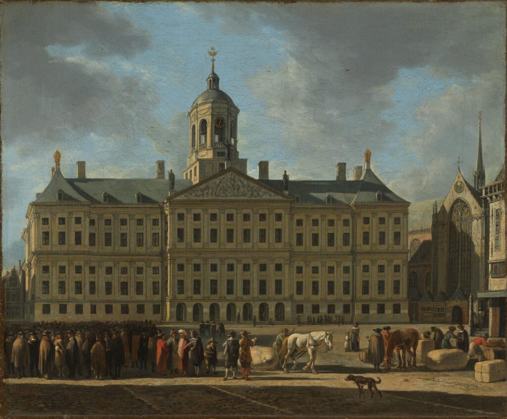 Gerrit Berckheyde schilderde in 1672 het stadhuis op de Dam in Amsterdam. Collectie Rijksmuseum Amsterdam, objectnummer SK-A-34.