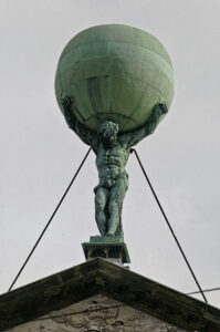 De Vlaamse beeldhouwer Artus Quellinus maakte dit bronzen beeld van Atlas die het wereldgewelf torst. Het beeld staat op het dak van het Paleis op de Dam in Amsterdam. Meestergieter Hemony goot het brons. Foto uit het besproken boek.