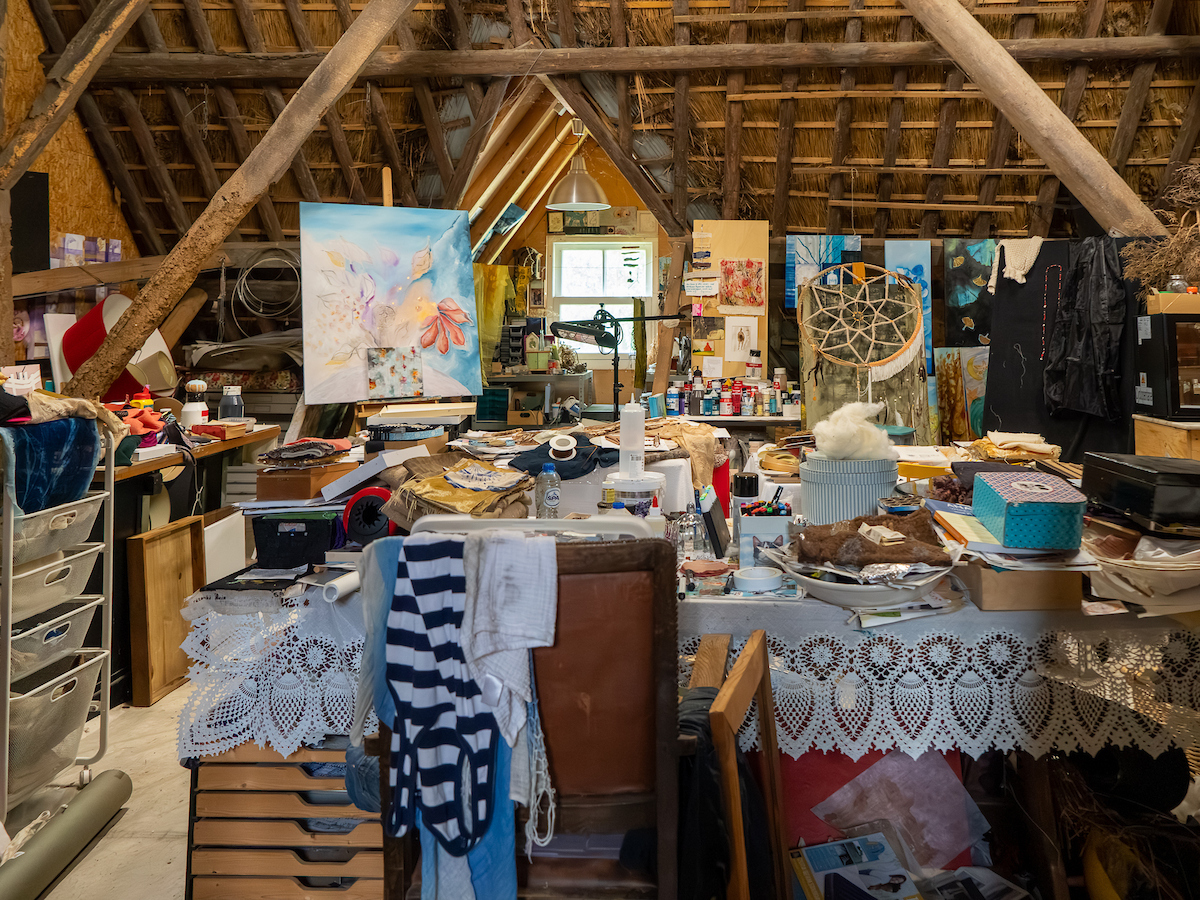 En Ada maakt meer dan alleen pigmenten, die ze gebruikt voor haar kunst die bijna in iedere ruimte terug te vinden is. Overal zijn de mooiste tableaus van schelpen, miniaturen, wol en vilt, droogbloemen en nog veel meer te vinden. De zolderverdieping is haar atelier en is al een wunderkammer vol inspiratie. Martin grinnikt dat hij een klein hoekje aan de keukentafel heeft en dat de rest van het huis van Ada is, maar ook zijn familiegeschiedenis is in de hele stolpboerderij terug te vinden.