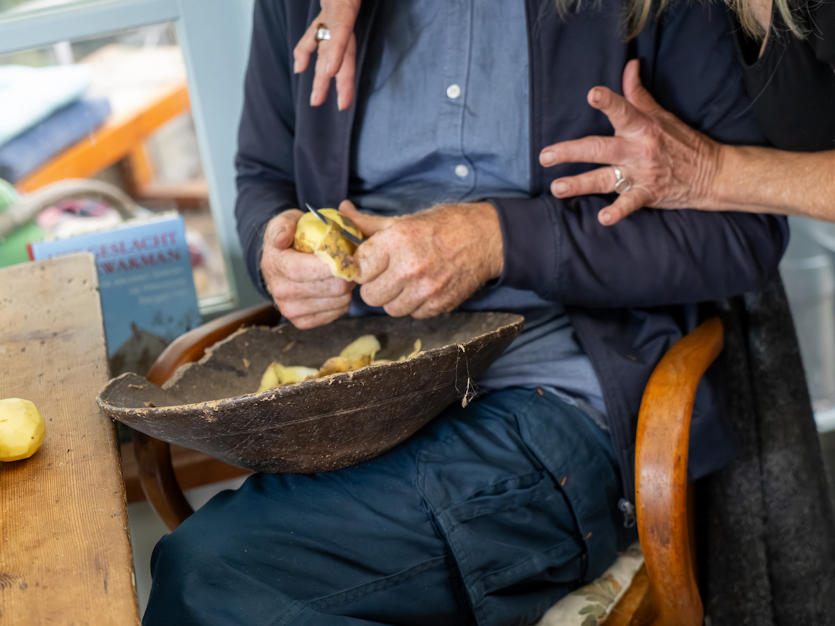 Martin en Ada zijn blij met de extra informatie over de stolpboerderij. Ze waren al verknocht aan de boerderij, maar dit geeft nog net een extra laagje glans. Maar nu moeten ze wel eerst de aardappels schillen en de lunch voorbereiden. Ondanks de herhaaldelijke uitnodiging slaan we de lunch af en vertrekken we weer door het West-Friese lint naar de volgende Binnenkijker.