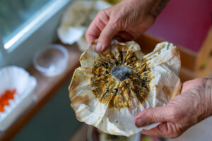 Tegenwoordig zie je, als je naar boven kijkt langs de imponerende staanders, dat de hele boerderij inderdaad wat naar achteren helt. En dat is helemaal niet erg. Het gezegde ‘de stolp staat 100 jaar en de stolp hangt 100 jaar’ heeft ‘t Are Huys al ruim bewezen en als het aan Ada en Martin ligt, zal de stolp nog honderden jaren blijven bestaan. Al vele jaren wonen zij in de stolp die Martin van zijn vader erfde en voedden zij hun vier kinderen Rozemarijn, Thijmen, Ninamaria en Tobias op. En er waren meer jonge voetstapjes in huis, want geruime tijd was het een geliefde Abbekerkse kinderopvang. Je ziet nu nog hoe fijn dit kinderparadijs was in de aanbouw aan de achterzijde. Met veel ramen en goed zicht op de tuin en het prachtige achterland was, en is, het goed toeven. Ada heeft nu alle ruimte om planten en bloemen te drogen om deze te benutten voor de door haar zelfgemaakte pigmenten. Ze is op dit moment druk bezig met het extraheren van Isatis tinctoria, oftewel wede, voor de kleur blauw.