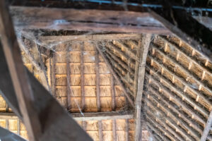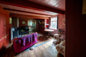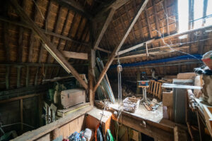 En deze bedstee, tegenwoordig in gebruik als comfortabele sauna, is niet de enige in de boerderij. Aan de straatzijde zijn er nog twee te vinden die nog in gebruik zijn als bedstee. Lachend vertelt Martin dat Dieuwertje Duijn van Archeologie West-Friesland tijdens haar werkbezoek aan de boerderij meteen de bedstee indook. Want juist in dat hoekje was een aanwijzing te vinden over de leeftijd van de boerderij. Zo vond ze ook op zolder dat de eikenhouten zwingen sporen van oude houtverbindingen hebben. Deze hebben dus eerst in een andere constructie gediend. Haar onderzoek wees ook uit dat er bij deze stolpboerderij juist geen overstek aan noord- of zuidzijde was. En dat is wel gebruikelijk. Wel is er een extra balk aanwezig aan de achterzijde waardoor er toch iets meer ruimte is gecreëerd.