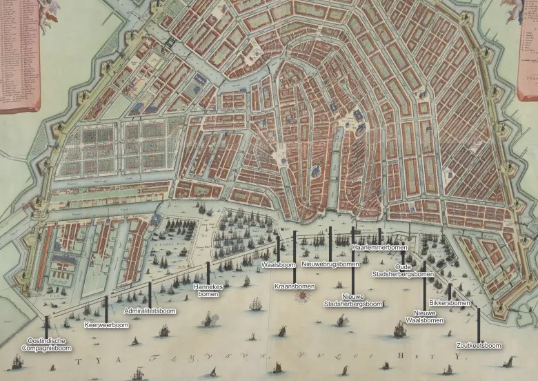 Als in de vroegmoderne tijd, vanaf ongeveer 1450, de poortklok luidt sluiten de poorten van Amsterdam. Maar voor een havenstad met kilometers aan havenfront heeft dat weinig zin als de hele waterkant van de stad open blijft. Daarom wordt in het havenfront de grens van de stad aangegeven met een palenrij in het IJ. De doorgangen worden met zogenaamde ‘bomen’ afgesloten. Er is dus ook een boomklok die luidt als de bomen dicht gaan. Bij veel van de doorgangen staan houten huisjes waarin belastinginners en soldaten de in- en uitvoer in de stad in de gaten houden. Reizigers die over het IJ aankomen kunnen in de Stadsherberg (vanaf 1662 in de Nieuwe Stadsherberg) overnachten tot de bomen en de poort op de steiger ’s ochtends weer opengaan.