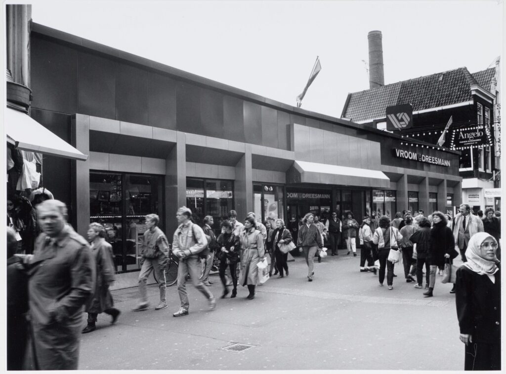 Bijgebouw van Vroom en Dreesmann, Kalverstraat 222 t/m 218 (v.l.n.r.). Vervaardiger Martin Alberts, 13 oktober 1988. Collectie Stadsarchief Amsterdam, Afbeeldingsbestand 010122015076.