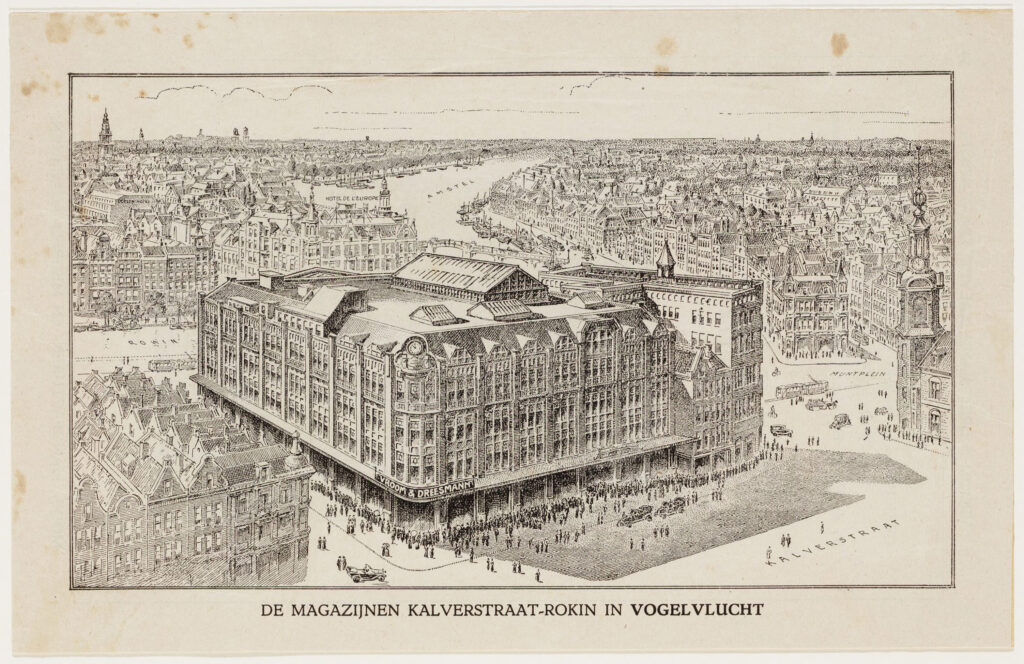 Het nieuwe gebouw van Vroom & Dreesmann aan de Kalverstraat 205-219 tussen St. Jorissteeg en Munt. Afbeelding uit folder ter gelegenheid van de heropening na de verbouwing en uitbreiding van 1918. Collectie Stadsarchief Amsterdam, Afbeeldingsbestand