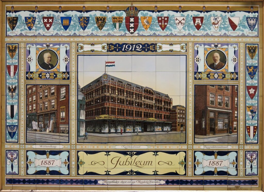 Tegeltableau ter gelegenheid van het 25-jarig jubileum van Vroom & Dreesman, ‘aangeboden door eenige Handelsvrienden’, 1912. Collectie Amsterdam Museum, beeld via Wikimedia Commons, publiek domein.