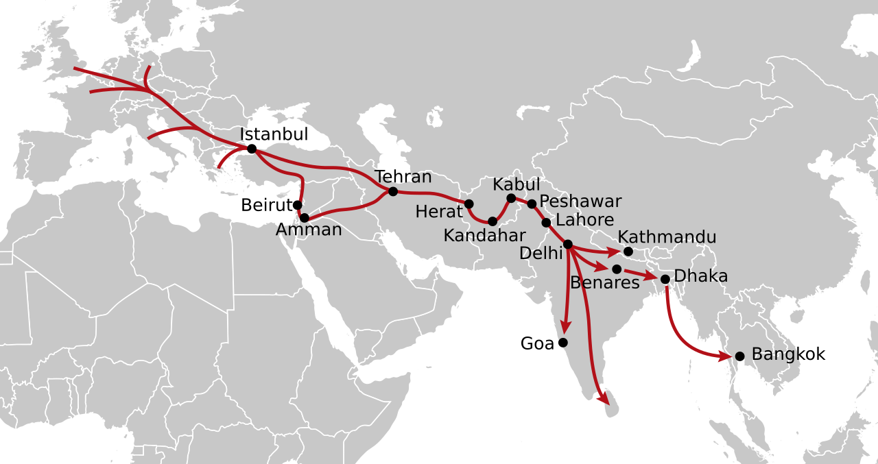 Kaart van de Hippie Trail richting India en Nepal. Beeld: NordNordWest, CC BY-SA 3.0 DE, via Wikimedia Commons.