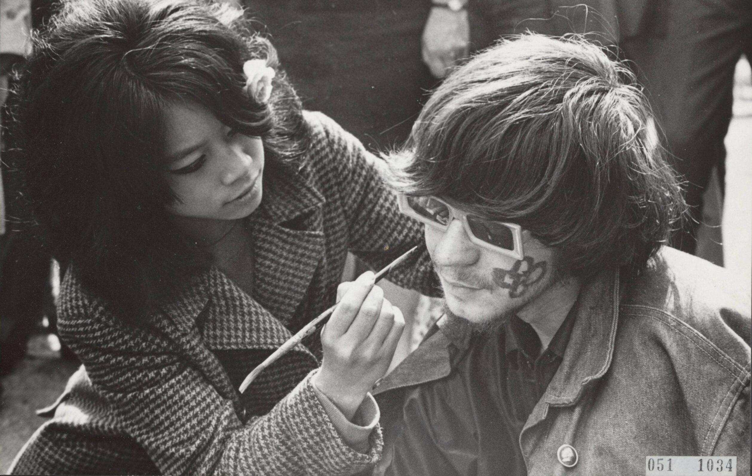Tijdens een ‘Love in’ in het Vondelpark te Amsterdam beschildert een vrouw het gezicht van haar vriend, 1967. Fotocollectie Elsevier Binnenland, Nationaal Archief.