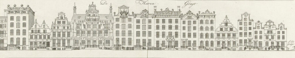 Detail van de prent: Gevels van huizenrijen aan de Keizersgracht naar de Hartenstraat en de Herengracht van de Leliegracht naar de Oude Leliestraat. Prentmaker: Caspar Jacobsz. Philips, 1768 – 1771. Collectie Rijksmuseum, objectnummer: RP-P-1921-611.