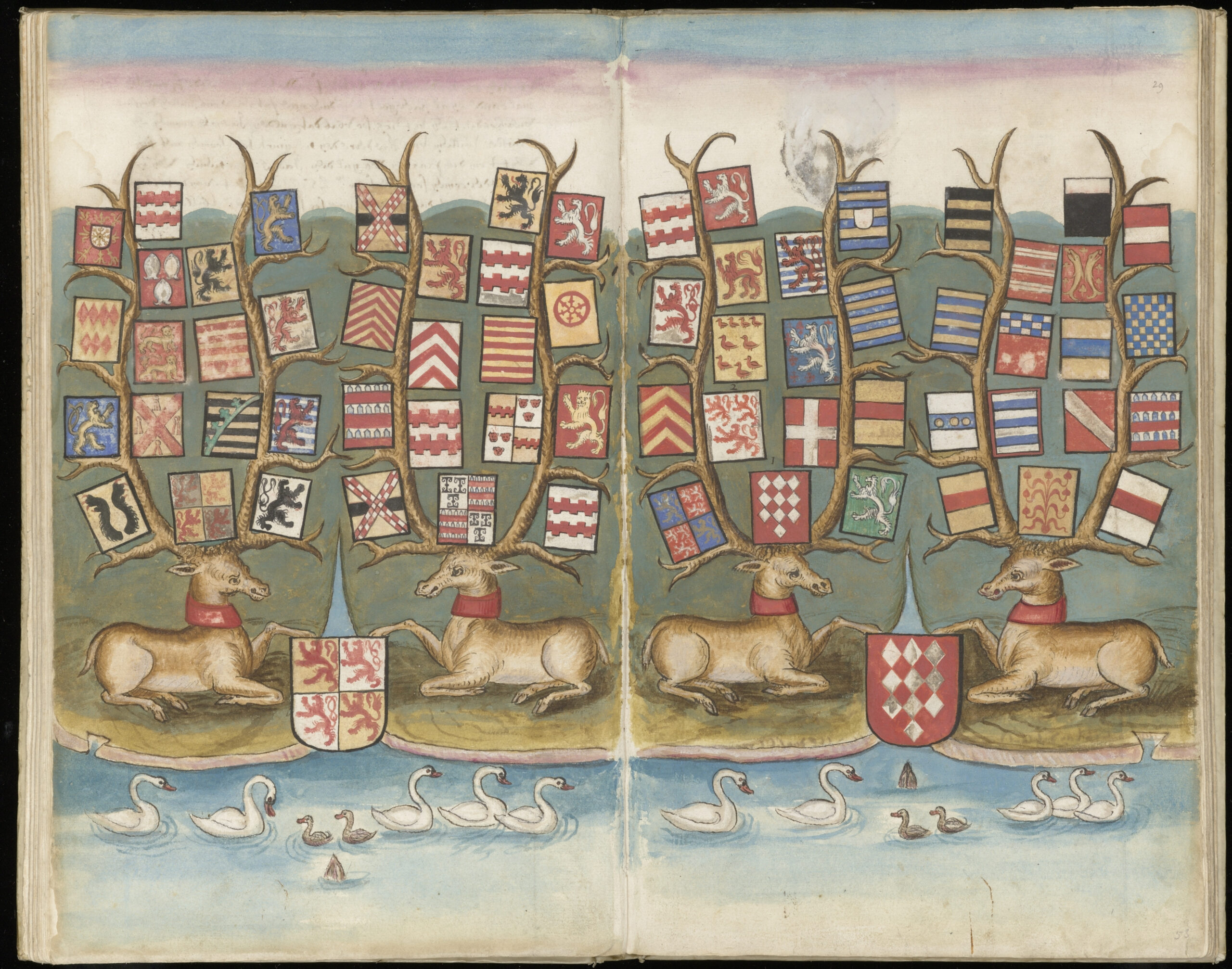 Kroniek van de heren van Brederode, met stamreeksen van de heren van Arkel en Egmond: ‘Dit is die tafel van dit, dat genoempt word die kroniek van Brederoden, series et stirps dominorum de Arkel, series dominorum de Egmond’, met gekleurde afbeeldingen en wapens, 16e eeuw; anoniem. Noord-Hollands Archief, Toegang 176 , inv.nr. 1040.