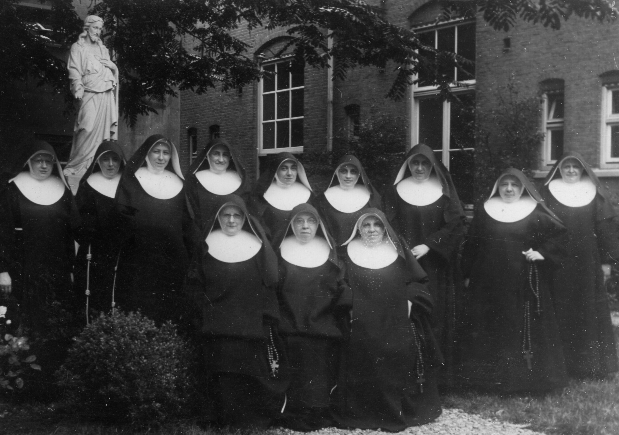 De zusters franciscanessen van Bennebroek droegen een bruin habijt, met om hun middel een wit koord met drie knopen. Het koord staat symbool voor de franciscaanse geest en de knopen stellen de drie geloftes voor: armoede (geen bezittingen), gehoorzaamheid aan God en zuiverheid (ongehuwd). Foto uit 1932. Collectie Katholiek Documentatie Centrum.