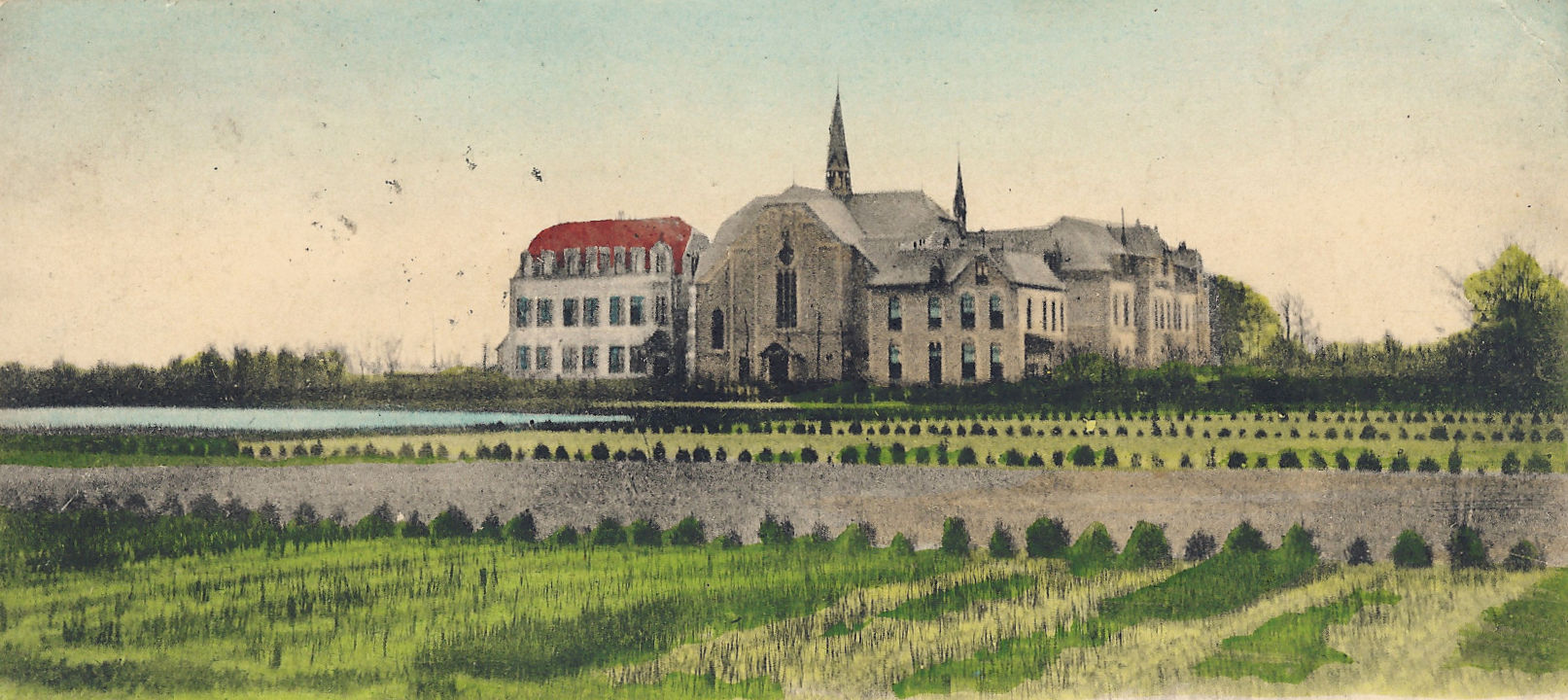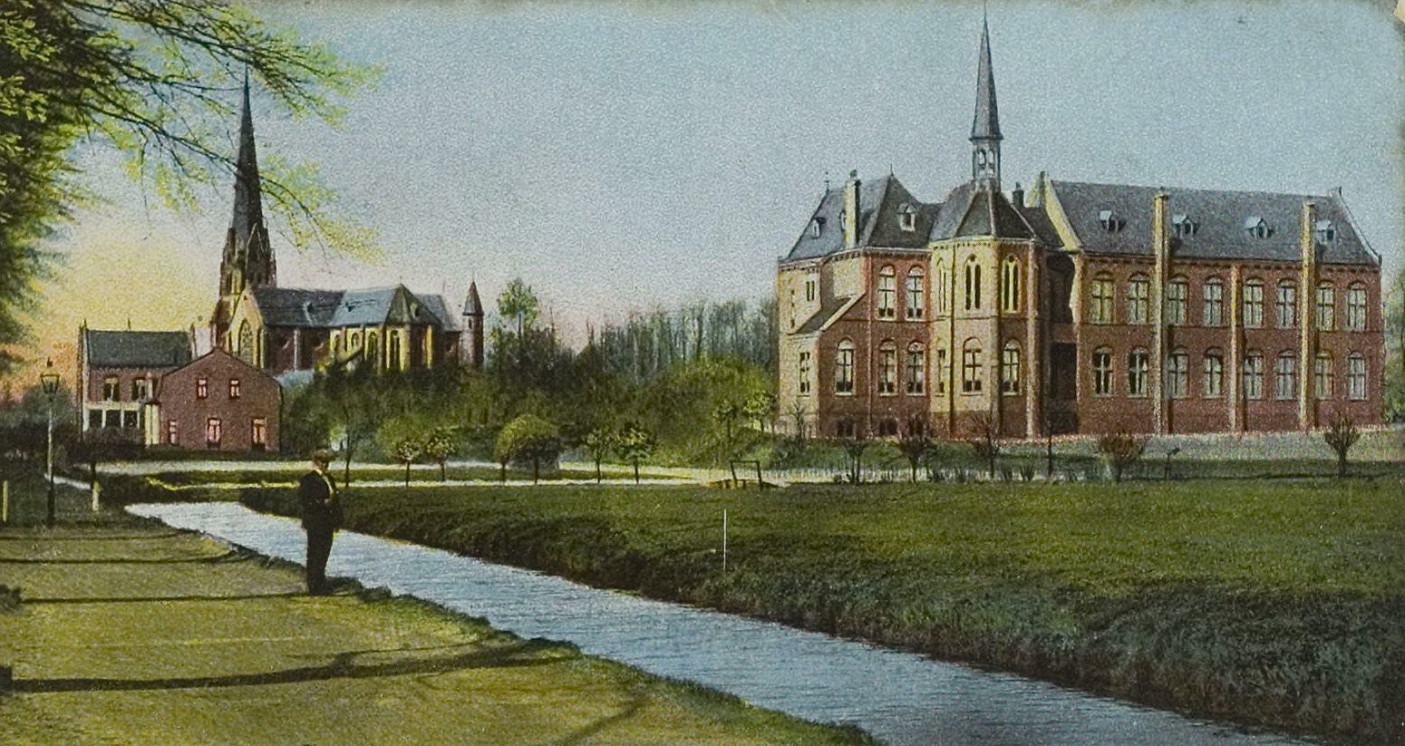 De rooms katholieke enclave buiten de dorpskern van Bennebroek, gebouwd tussen 1895 en 1900. Gezien vanaf de Meerweg: links de Heilig Hartschool (de latere Jozefschool), in het midden de Sint Jozefkerk met rechts de pastorie en daarachter het klooster (ca. 1900). Collectie Noord-Hollands Archief.