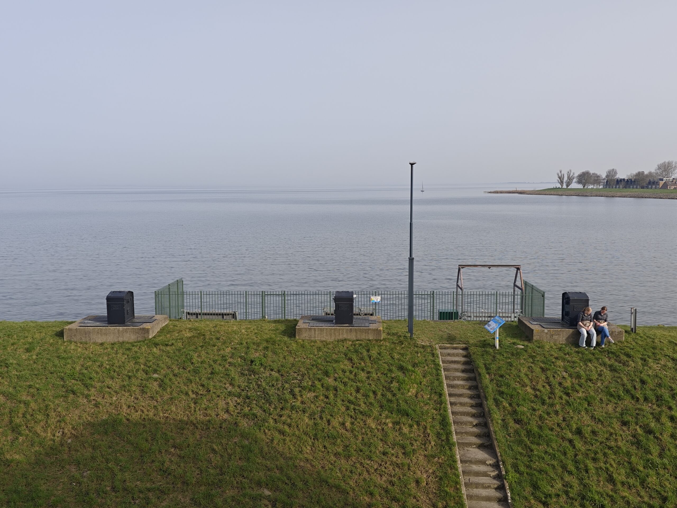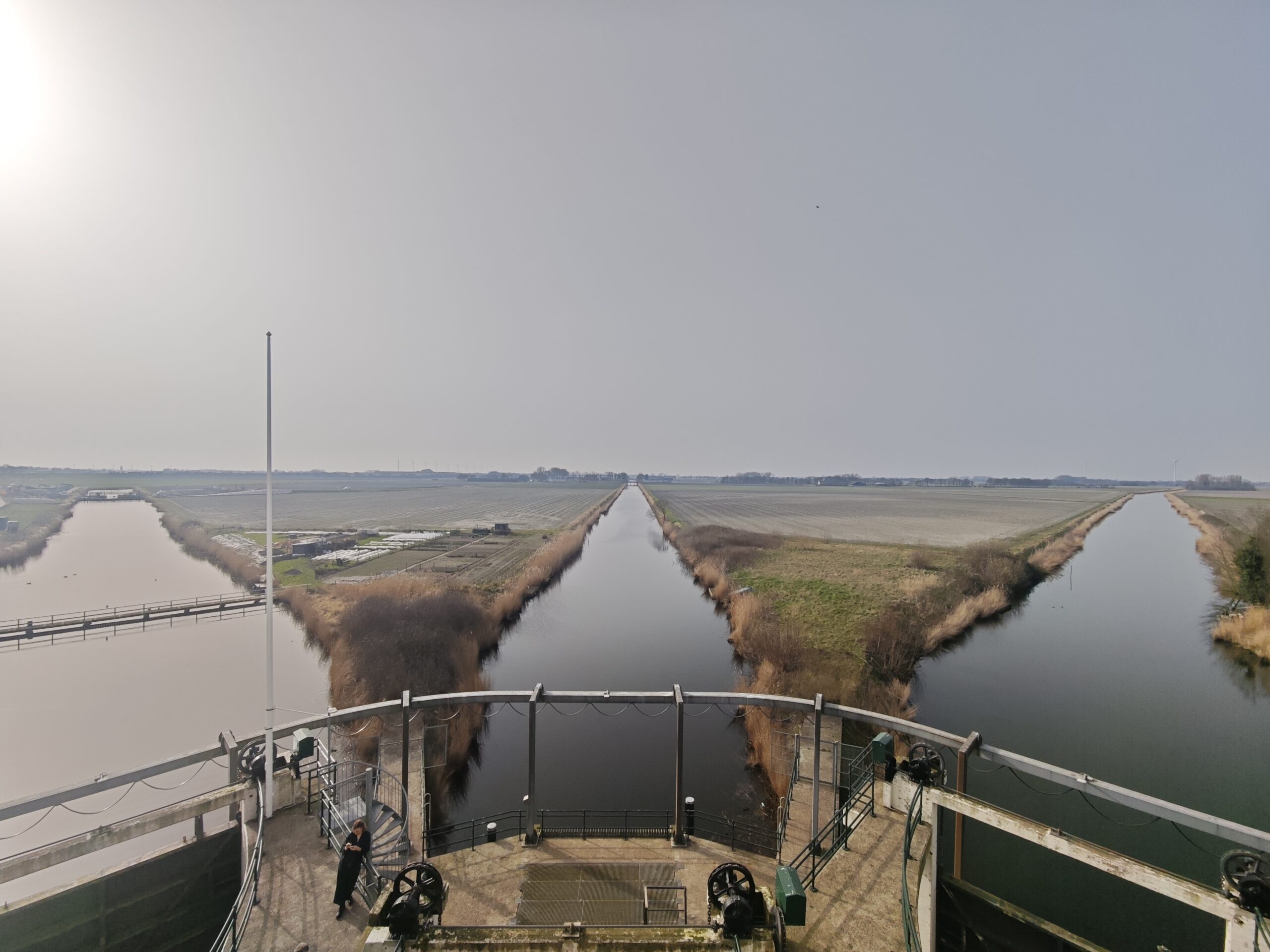 Vanaf het plateau zijn drie peilvakken met verschillende waterstanden te zien, die geregeld worden door gemaal Lely. Foto: Sarah Remmerts de Vries.