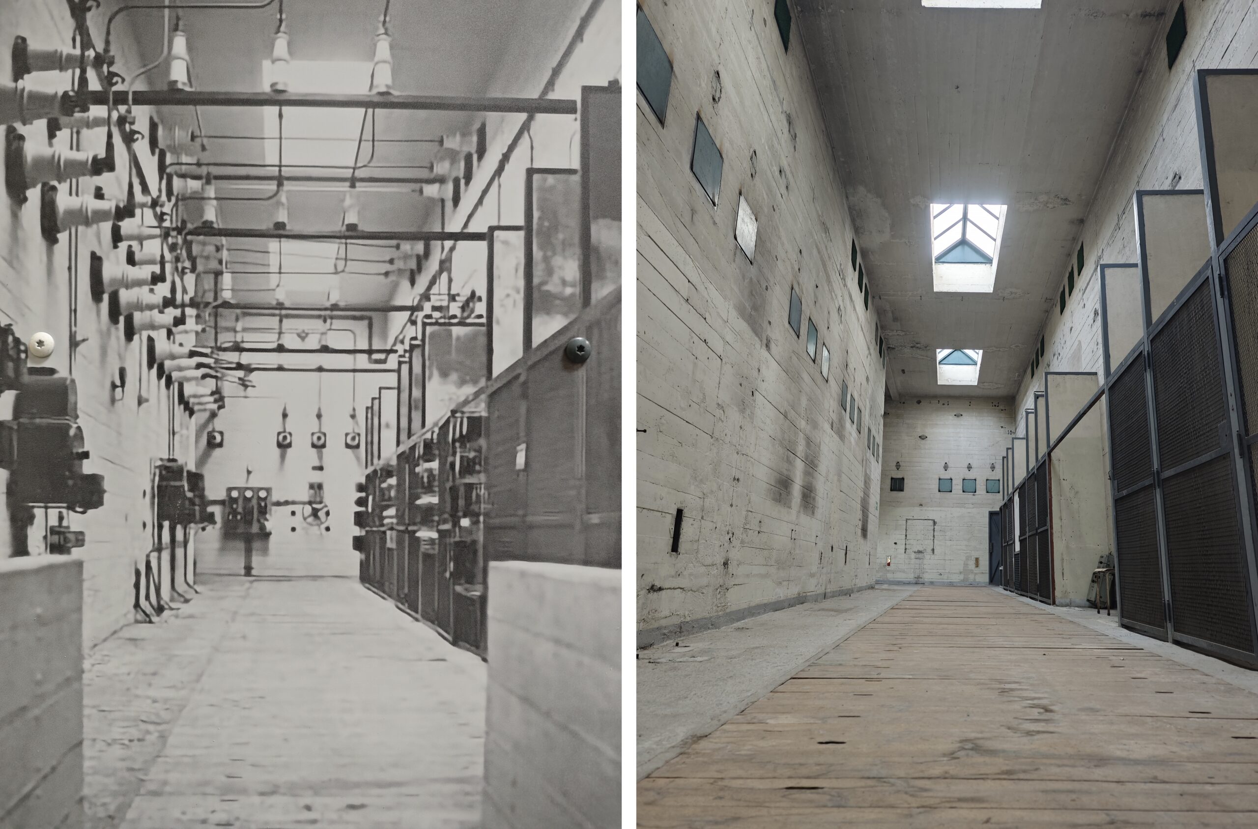 Links: historische foto van de elektriciteit op de bovenverdieping van gemaal Lely. Rechts: de hedendaagse situatie op dezelfde plek. Foto: Sarah Remmerts de Vries.