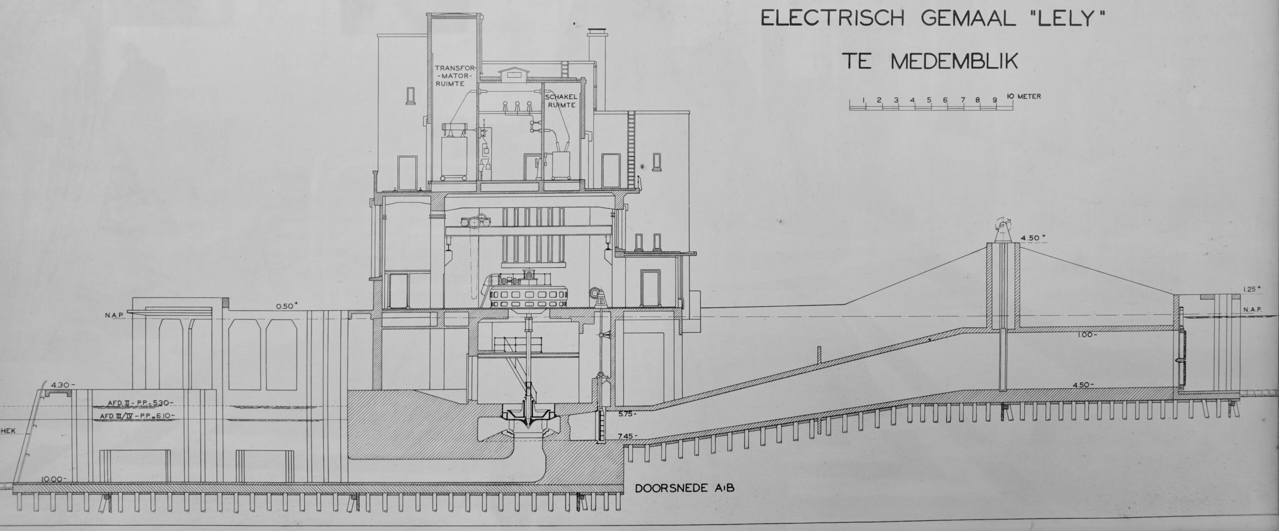 Bouwtekening van gemaal Lely. Bovenin zijn de transformatorruimte en schakelruimte te zien, die de elektriciteit regelden. Foto: Sarah Remmerts de Vries.