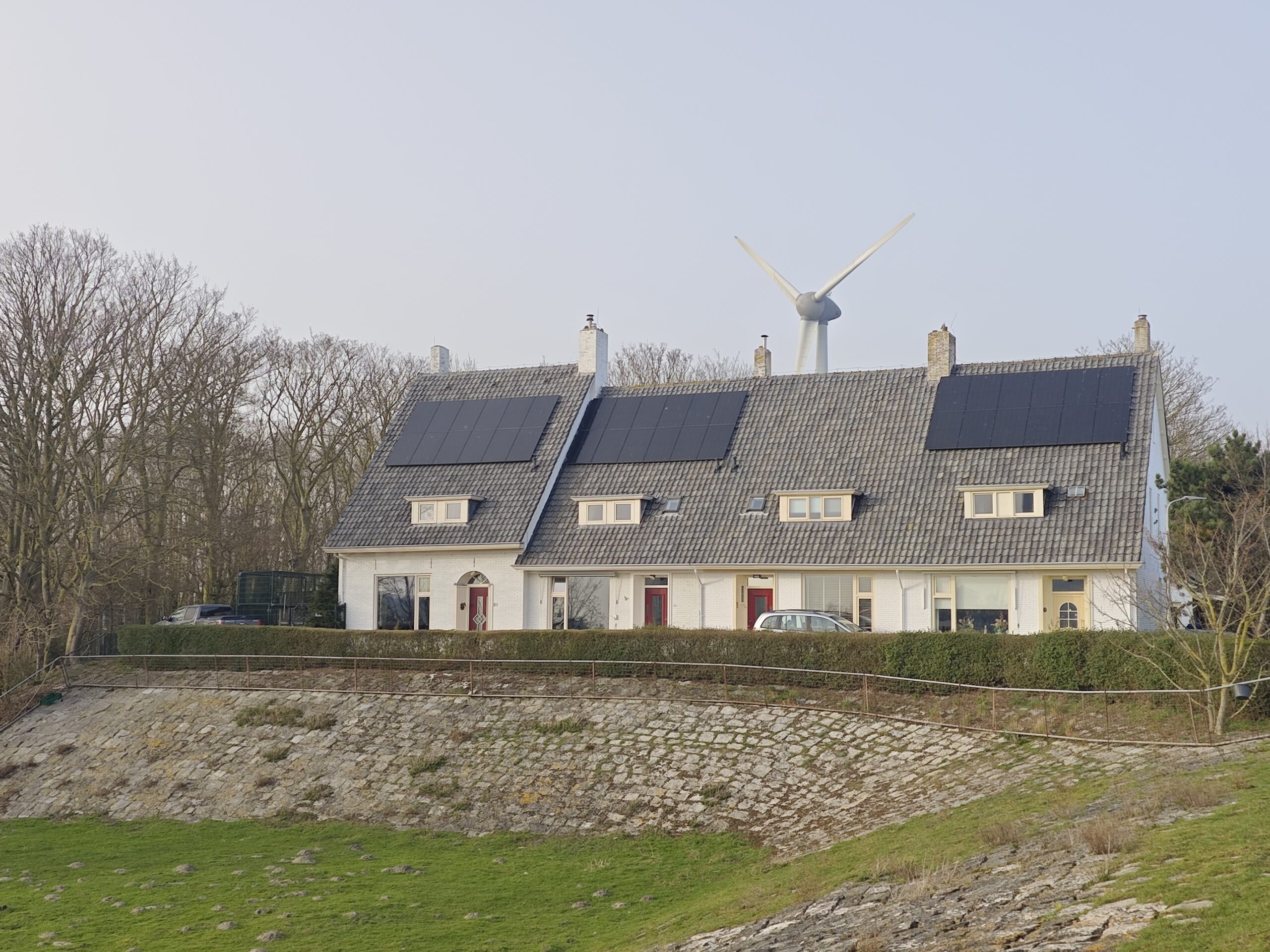 De vier machinistenwoningen naast het gemaal, met geheel links (iets groter dan de andere huizen) de woning van de hoofdmachinist. Hier werd naar verluid het eerste kind van de Wieringermeer geboren. Foto: Sarah Remmerts de Vries.