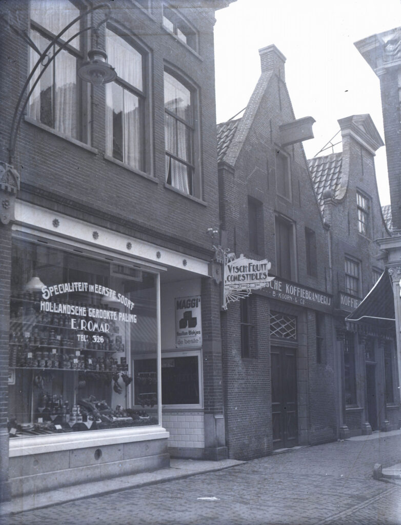 Gevels Fnidsen 115-119 (later 101-107). Links op 115, E. Romar, winkelier met reclame Visch Fruit Comestibles. Op 117-119, B. Koorn & Co, koffiebranderij, ca. 1930. Bouw- en Woningtoezicht Alkmaar / Collectie Regionaal Archief Alkmaar, fotonummer: RAA-GLAS-000061.