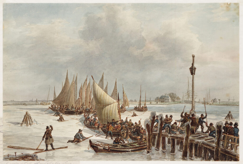 Eeuwen geleden was het niet vreemd als groot water dichtvroor of last had van ijsvorming. Zoals hier op de tekening Wintergezicht op het bevriezende IJ door Hendrik Vettewinkel, dat de aankomst over ijs van Noord-Hollandse melkschuiten toont. Stadsarchief Amsterdam / Collectie Atlas Splitgerber, Afbeeldingsbestand 010001000700.
