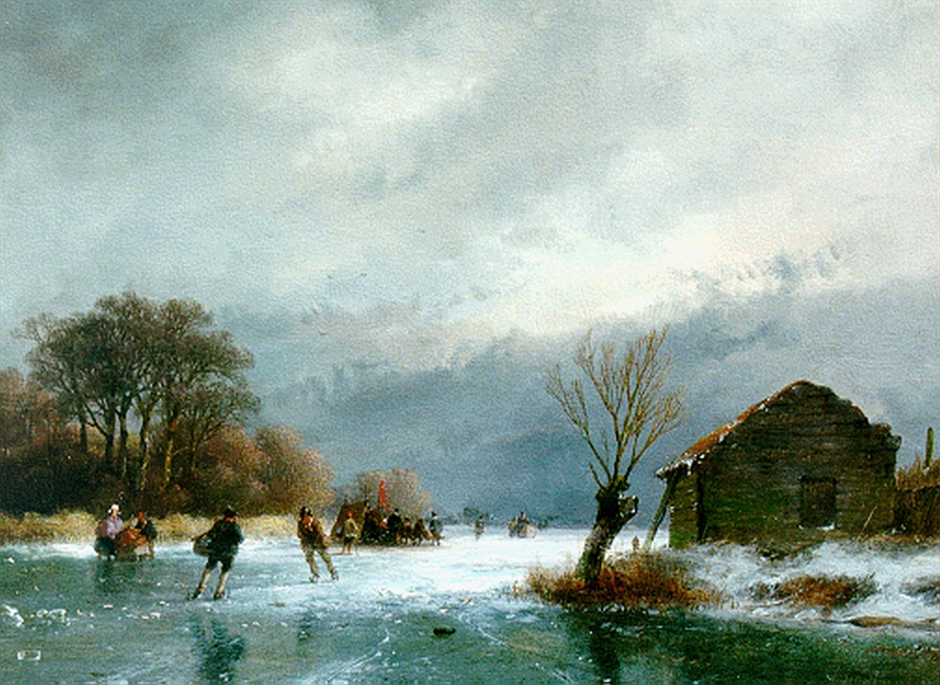 Klaas en Willem Oostindie schaatsten de Twaalfstedentocht omgekeerd. Ze begonnen bij Alkmaar en eindigden in Haarlem, dat u in hier de verte ziet liggen op het schilderij Winterlandschap met schaatsers door Andreas Schelfhout. Beeld via Wikimedia Commons, publiek domein.