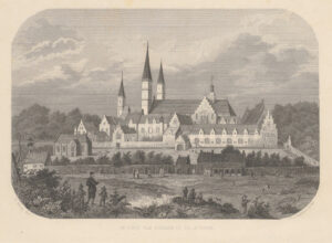 Op deze staalgravure is de Abdij van Egmond te zien op het toppunt van haar macht in de zestiende eeuw. Valentijn Bing en Jan Frederik Christiaan Reckleben maakten deze tekening tussen 1836 en 1838. Uit de collectie prenten en tekeningen van de Provinciale Atlas van het NHA (359). Inventarisnummer 2699.