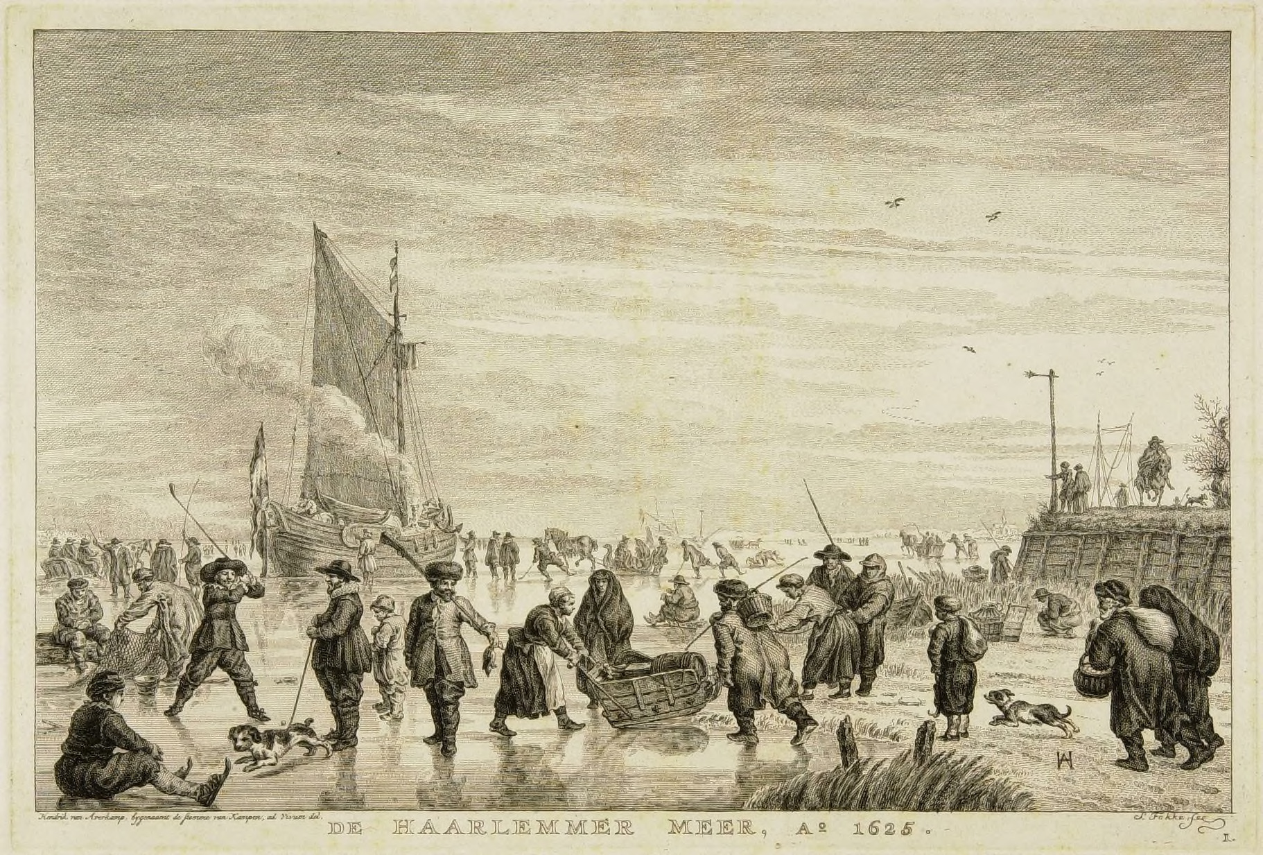 Dat de Haarlemmermeer niet alleen voor ellende zorgde, bewijst deze prent van anno 1625. Simon Fokke tekende dit ijsvermaak naar Hendrick Avercamp, circa 1730-1784. 1100 – Beeldcollectie gemeente Haarlem. Inventarisnummer 42290.