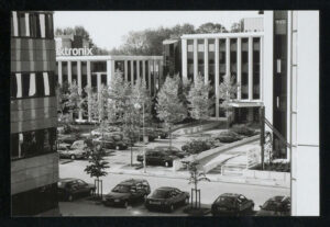 Door de ligging onder de rook van Schiphol en op steenworp afstand van Amsterdam, groeide Hoofddorp uit tot een van de meest gewilde kantorenlocaties van het land. Hans Poulsen maakte deze foto in 1992 van de kantoren op Beukenhorst. Noord-Hollands Archief / Beeldcollectie van het Historisch Archief Haarlemmermeer te Hoofddorp, inventarisnummer 2780.