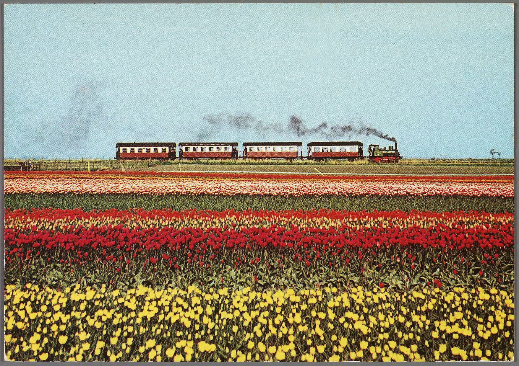 Museumstoomtram en tulpenvelden bij Twisk, circa 1960-1980. Foto van F. van der Gragt. 162, prentbriefkaarten uit de collectie van de Provinciale Atlas van het NHA. Inventarisnummer 26283.