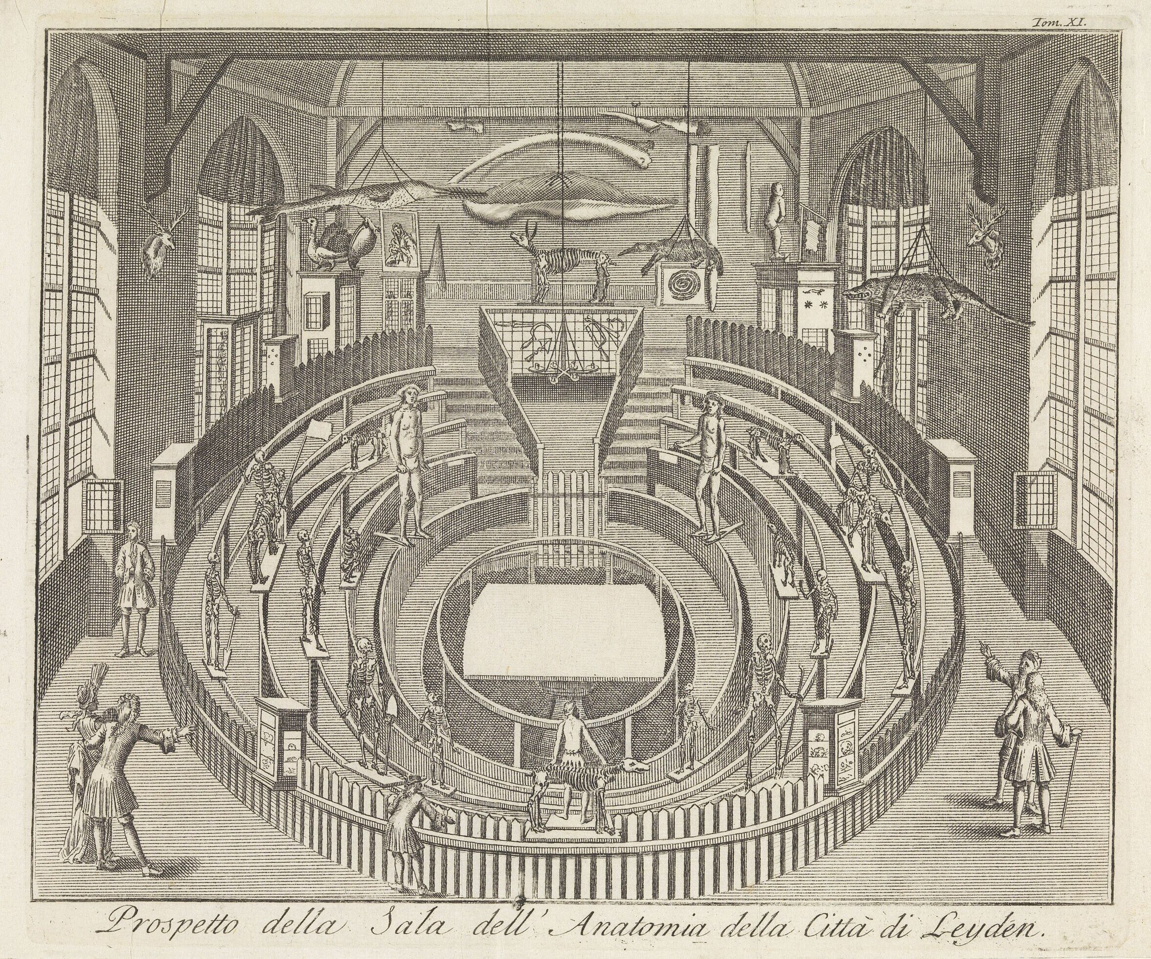 Prent van het theatrum anatomicum in Leiden door de Italiaanse prentmaker Giuseppe Filosi, 1742. Collectie Rijksmuseum Amsterdam.